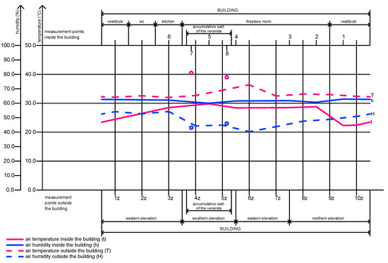 The use of the glazed veranda on the south side of the building as a kind of greenhouse accumulating temperature is confirmed by a definitely higher temperature inside it than in other points of the building. The use of the veranda has fulfilled its role as a temperature accumulator. Although the temperature in the veranda is considerably higher, still no dew point was detected in the wall between it and other rooms.