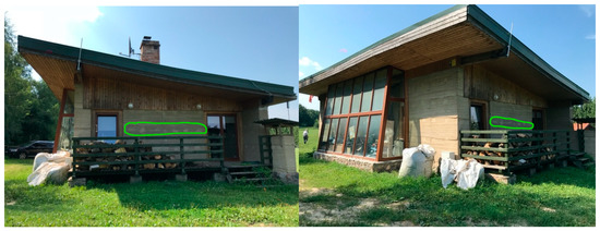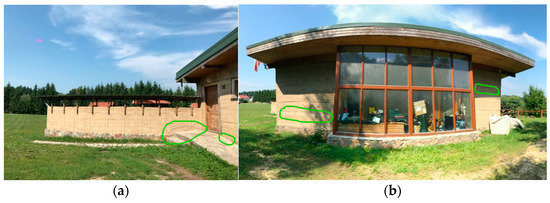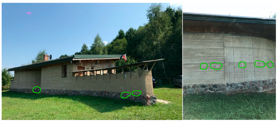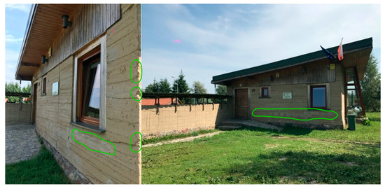 During the architectural and technical site visit, observations of the resilience of raw-earth technology to the climate conditions were conducted. The biggest danger for this technology is water. Observations are shown on the photos for each elevation with visible defects on the wall after tie bars were used during wall construction, after raining water in the plinth zone and defects on some corners (Figure 12, Figure 13, Figure 14 and Figure 15).