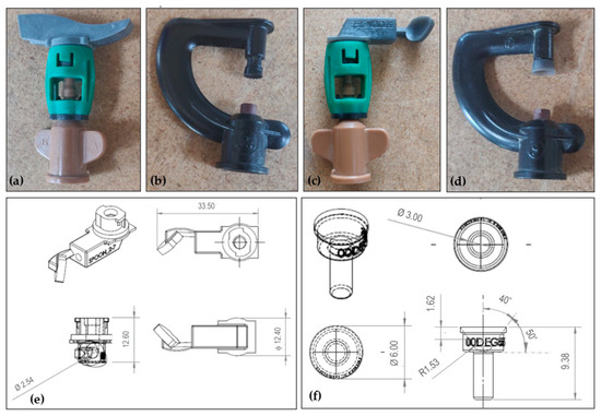 Off-the-shelf emitters (a) E1 and (b) E3 and modified emitters (c) E2 with (e) spoon type swivel deflector and (d) E4 with (f) static spreader of 50° deflection angle and smooth edge (all schematic dimensions are in mm).
