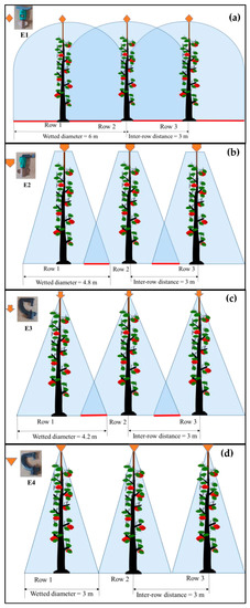 The modified emitters were evaluated in the lab by assessing spray coverage and wetted diameter on water-sensitive papers (WSPs). These preliminary lab trials indicated that the spoon-type swivel plate deflector and the static spreader with a 50° angle were suitable modifications to E1 and E3, respectively, to obtain the desired spray pattern. The modified emitters with a re-designed swivel plate and static spreader are hereafter termed as E2 (Figure 2c) and E4 (Figure 2d), respectively. The detailed specifications of the emitters are provided in Table 1. Four SSCDS treatments with emitters in a shower-down arrangement were developed using E1, E2, E3, and E4, hereafter termed as SD1, SD2, SD3, and SD4, respectively.