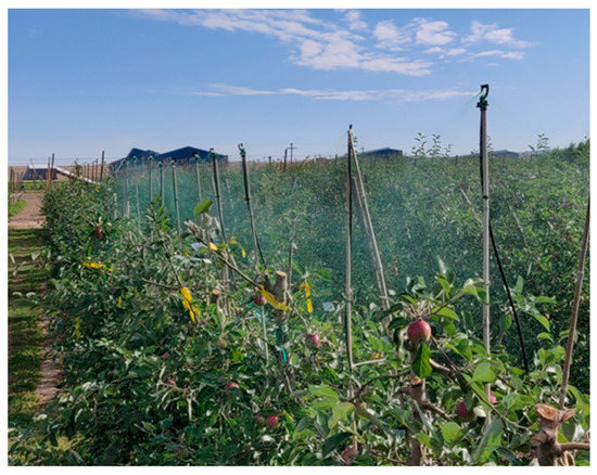Experimental site: high-density apple orchard trained in tall spindle architecture and installed with hydraulic spray delivery based solid set canopy delivery system configured in shower-down configuration (growth stage: full canopy; SSCDS configuration: SD4; imaged: 3 July 2019).