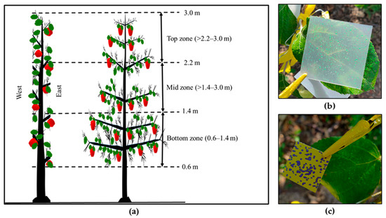 Depiction of allocated (a) canopy sampling zones, (b) mylar card, and (c) WSP samplers installed in each of the sampling zones for deposition and coverage evaluation (All dimensions are refereed above ground level).
