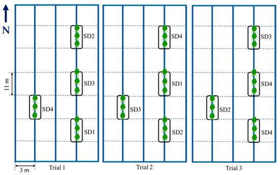 The allocated SSCDS treatments (SD1, SD2, SD3, and SD4) for different trials (Trial 1: 28 June 2019; Trial 2: 1 July 2019; Trial 3: 3 July 2019; schematic is not drawn to the scale; N represents the true north direction).