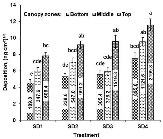 Cube root-transformed mean spray deposition evaluated in different canopy zones for various SSCDS treatments (SD1, SD2, SD3, and SD4). Different lowercase letters above individual bar plots indicate the significant differences in transformed mean at α = 0.05, and associated error bars indicate standard error; non-transformed mean deposition (ng cm−2) values are indicated within the transformed bar plots.