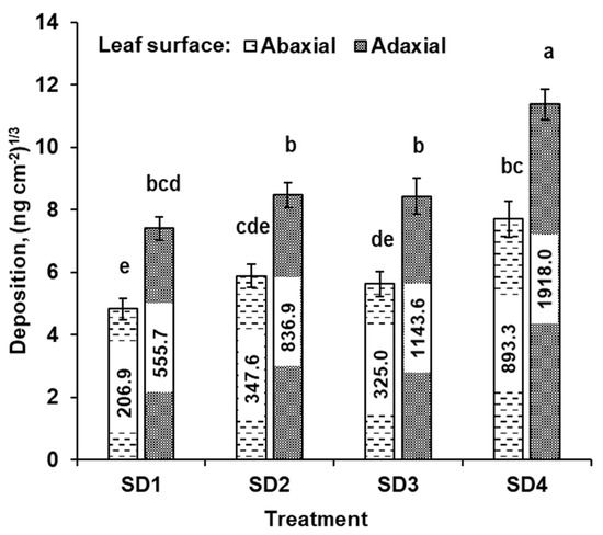 Cube root-transformed mean spray deposition evaluated at abaxial (lower) and adaxial (upper) leaf surfaces for tested SSCDS treatments (SD1, SD2, SD3, and SD4). Different lowercase letters above individual bar plots indicate the significant differences in transformed mean at α = 0.05, and associated error bars indicate standard error; non-transformed mean deposition (ng cm−2) values are indicated within the transformed bar plots.