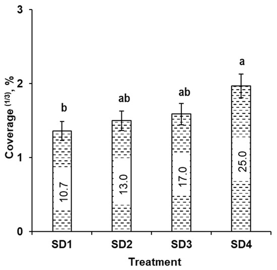 The cube root-transformed mean spray coverage (%) obtained for tested SSCDS treatments (SD1, SD2, SD3, and SD4). Different lowercase letters above individual bar plots indicate the significant differences in transformed mean at α = 0.05, and associated error bars indicate standard error; non-transformed mean coverage (%) values are indicated within the transformed bar plots.