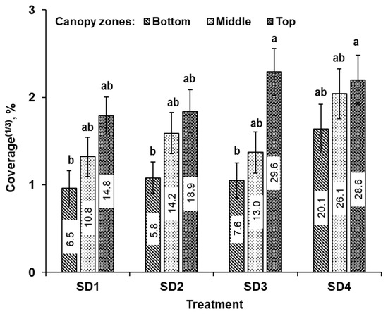 The cube root transformed mean spray coverage (%) obtained at canopy zones (top, mid, bottom) for different SSCDS treatments (SD1, SD2, SD3, and SD4). Different lowercase letters above individual bar plots indicate the significant differences in transformed mean at α = 0.05 and associated error bars indicate standard error; non-transformed mean coverage (%) values have been indicated within the transformed bar plots.
