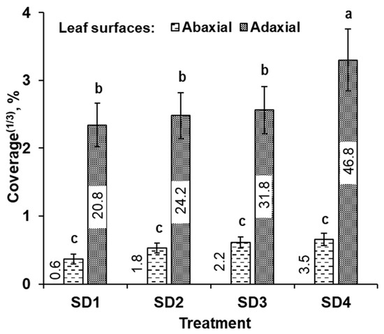 The mean spray coverage of the adaxial leaf surface was significantly higher than that of the abaxial surface (p < 0.001) regardless of the SSCDS treatment. Moreover, a significant interaction effect was reported between SSCDS treatments and leaf surfaces (F3,54 = 3.4, p = 0.02) as a main effect (Table 5). The SD4 treatment had the highest adaxial and abaxial spray coverage (46.8 ± 4.3% and 3.5 ± 1.3%, respectively) followed by SD3 (31.8 ± 4.4% and 2.2 ± 1.0%, respectively). However, there were no significant differences in abaxial leaf surface coverage among the studied treatments (Figure 12).