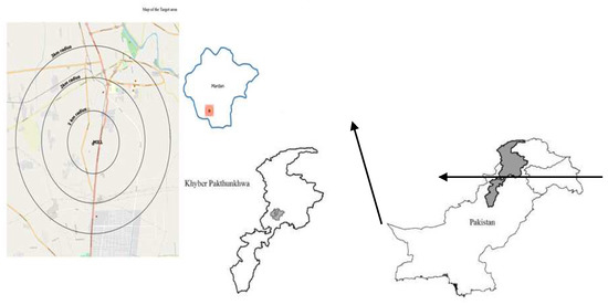 For this study, a sample of households was selected using multistage sampling [30]. First of all, from the whole country, the Khyber Pakhtunkhwa Mardan district was purposely selected [31]. In the second stage, the area within a 3-km radius of Premier Sugar Mills Mardan was selected. In the third stage, a sample of households within a 3-km radius (Figure 1) of the mill was taken through simple random sampling. A sample of 200 households was taken using Cochran’s (1977) sample size determination [32]. Keeping in view the “Central Limit Theorem [33]”, the sample size was doubled. Within these 200 households, 1141 individuals’ data were collected.