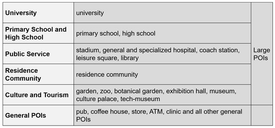 Therefore, the POIs are reclassified in pedestrian crossing demand measurements and function identification of road sections respectively. For the former, the POIs cover a large area and are very attractive to pedestrians are selected as “Large POIs” in this paper, such as universities, hospitals, and parks. All other POIs are “General POIs”. All of the General POIs are combined into one category, and the Large POIs are divided into five categories according to the similarity of their functions (Figure 2).