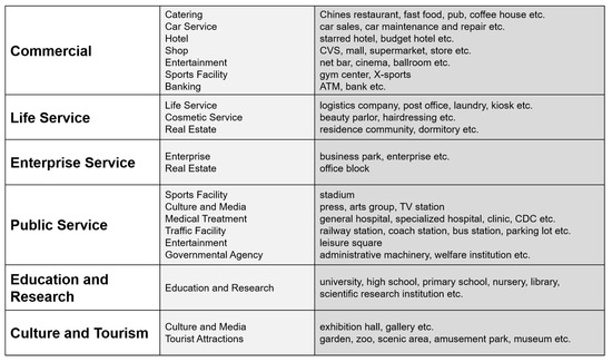 In Baidu Map open platform, POIs are divided into 17 first level categories. However, there are two main shortcomings in this classification. On the one hand, the spatial scale and the ability to attract people of different POIs can be very different, for example, a park’s size and the ability to attract people are far greater than a convenience store. Unfortunately, the classification of original POI data is unable to distinguish these differences. On the other, because the function identification of target road sections is based on POI data, the category structure of POIs (associated with the certain road section) determines the function of a certain road section. However, the original POI data categories are too complex, and the existing classification results do not apply to the function identification of road sections.