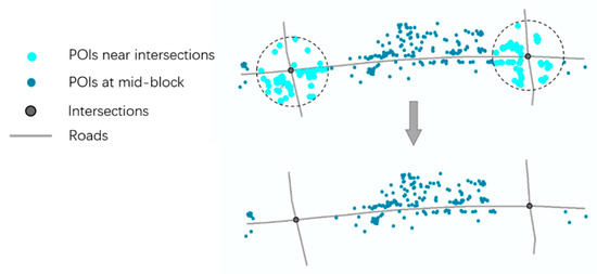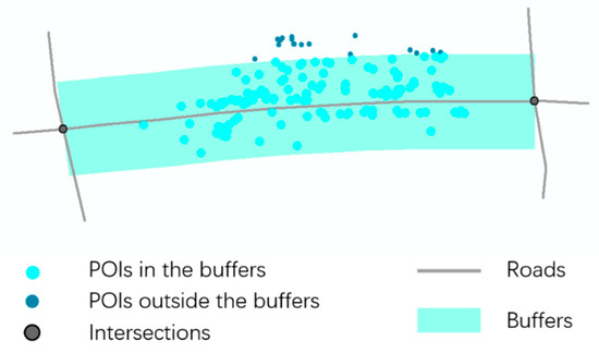 Moreover, POIs on both sides of the urban road may be located near intersections or at mid-block points away from intersections; however, this study only focuses on pedestrian crossing demand at mid-block points. Therefore, we excluded the POIs near intersections (not more than 100 m away from intersections), and retained POIs with a distance greater than 100 m from intersections (Figure 4).