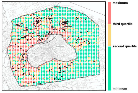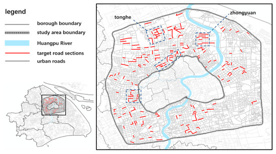 In the study area, 215 target road sections were identified (Figure 6); most of them are distributed in Puxi (the region west of Huangpu River). This is because, compared to Pudong (the region east of Huangpu River), Puxi has a longer development time and more residents. Meanwhile, we can see that there are more potential contradictions between supply and demand in Puxi. Additionally, we find that the target road sections are clustered in some areas, of which the Zhongyuan area and the Tonghe area are dwelling districts. In Chinese cities, the residence communities are generally located in large blocks, and there are a large number of service facilities and frequent resident activities on the road around the residence communities. Therefore, dwelling districts should be key areas to enhance street quality and pedestrian experience. For all 215 target road sections, pedestrian crossing facilities are strongly needed. Based on the results of this research, we can conduct field survey on each target road-section and make an appropriate design plan for the practical traffic improvement projects.