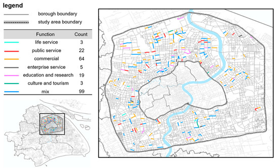 The identification results show that the number of the road sections with mixed function is the greatest, followed by the road sections with commercial function (Figure 7). However, the number of the road sections with life service function is the least. The significance of identifying the function of the target road sections mainly lies in two aspects. The first is to lay the foundation for our subsequent research (further in-depth study on different types of target road sections). The second is to guide the practical traffic improvement project design. For example, on the target road sections with enterprise service function, an overpass (or underpass) can be considered to serve a large number of commuters during rush hours. Commuters do not have to wait long before crossing the street, which can relieve their time pressure and reduce the occurrence of illegal crossing.