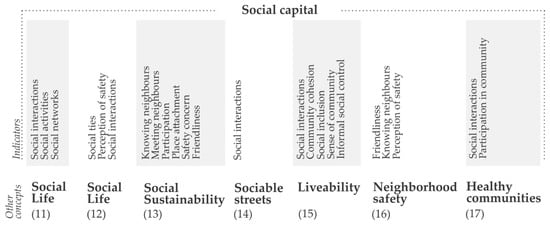 Likewise, for this analysis, analogous concepts such as: Social Life [11,12]; Social Sustainability [13]; Sociable Streets [14]; Liveability [15]; Neighbourhood Safety [16] y Healthy communities [17] were taken into account. Derived from an exhaustive review of the theory, it was considered that these concepts integrate indicators similar to those of SC (see Figure 1).
