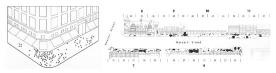The most recurrent instruments validated by the review authors are: the Social Capital Scale [57]; the Community Index SCI-2 [58]; and the Saguaro Seminar on Civic Engagement in America Survey [59]. Some authors took these instruments in their entirety and others made some adjustments. In addition, given the need for a better understanding of the spatial dynamics of SC, some studies have chosen to include mapping and observation techniques in their methodological strategies that allow measuring social interactions and their relationship with the place. Behavioural maps [31,33] (see Figure 2), Activity mapping [14], and Social network maps [11], are effective and feasible methods to understand the relationships between social dynamics and place, since they provide answers regarding temporality (time of day, season of the year). Each map shows an image of the moment in a specific place in addition to taking into account other causal factors, such as the built environment.