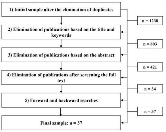 Following these criteria, the initial sample was independently reviewed by the first two authors. The first step was to exclude the remaining articles based on their title and keywords with these criteria set. This led to an elimination of 435 articles. In the next iteration, the remaining articles’ abstracts were investigated, leading to a further 382 eliminations. We investigated the full text of the remaining 421 articles and eliminated 387 more. We did forward and backward searches in the articles that remained and were able to find three additional papers. This led to a final sample of 37 articles which we then analyzed. Table 2 shows the final sample of publications that we investigated.