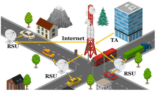 Vehicular networks, also referred to as vehicular ad-hoc networks (VANETs), are a component of an ITS and can be defined as a self-organized network in that vehicles can communicate with each other (vehicle-to-vehicle, V2V) and with the infrastructure (vehicle-to-Infrastructure, V2I) [109]. Such a VANET allows vehicles to share information about weather conditions or road defects, for example, thus increasing the security and efficiency of the traffic [110]. The communication is enabled by a communication protocol called dedicated short-range communication (DSRC). With wireless communication devices called on-board units (OBUs), the autonomous vehicles can communicate with each other and road side units (RSUs) [110]. A trusted authority (TA) is another component responsible for managing the whole system [109]. Figure 3 gives an overview and illustration of a VANET. However, to guarantee secure communication, several issues concerning privacy and security need to be addressed [110]. Furthermore, VANETs are vulnerable to many possible attacks [111]. Security in VANETs is crucial, as attacks might directly involve or endanger human lives. With vehicles becoming increasingly autonomous, the need to securely exchange data becomes important. Here, blockchain-based smart contracts can serve as a foundation for a variety of intelligent transportation scenarios. Next to ITS, VANETs therefore present another blockchain case discussed herein [72,75,105,107].