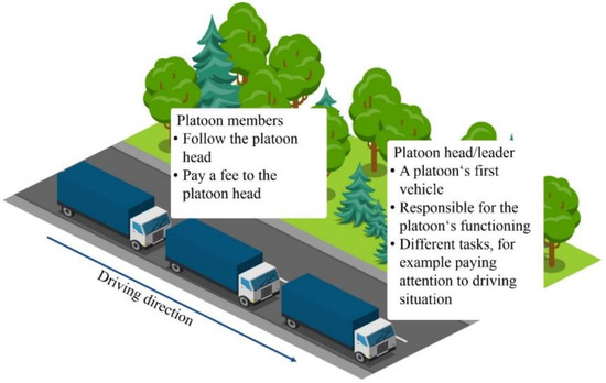 Finally, there are use-cases utilizing blockchain in the context of truck platooning. A truck platoon can be defined as a group of self-driving trucks moving together in convoy [122]. Truck platooning presents many advantages, including cost savings due to reduced fuel consumption [122,123,124], and the resultant reduced emissions [125]. In addition, truck platoons enable more efficient use of the infrastructure by taking up less road space, which reduces the risk of traffic congestion, and increases possible traffic throughput [126,127,128]. The vehicles participating in a platoon can be divided into two groups. The platoon leader (PL), sometimes also called platoon head (PH), is the first vehicle of a platoon. It is followed by one or more platoon followers or platoon members (PMs) [106,107]. The PL fulfills different tasks, for instance, paying attention to the driving situation [129]. The PL is also responsible for the platoon’s functioning, involving tasks like sending data to platoon followers or coordinating platoon movement and maneuvers [107]. An illustration of a platoon is depicted in Figure 4.