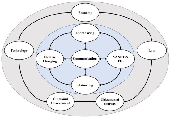 One of the major targets of smart city initiatives is alleviating the existing congestion conditions in most metropolitan regions. The solutions vary from self-driving cars that eliminate automobile ownership to sensor deployment in vital urban infrastructure [61]. One of the dimensions of a smart city is referred to as smart mobility. According to [17], smart mobility is a buzzword for combining different technologies and approaches. The overarching goal of smart mobility is to make the transportation of people and goods more sustainable and efficient [8,17,62]. Intelligent transportation systems (ITS) have emerged with the goal to apply several advantages to mobility, like improving travel security and increasing the performance of transportation systems [63]. In addition, ITS enables smart vehicles to communicate with each other and access the internet [22]. Smart mobility is also a critical component of the urban environment’s functioning. However, transportation presents several significant issues and negative consequences for citizens’ quality of life, such as pollution or longer travelling times. Smart mobility aims to assist cities in reducing traffic, accident rates, and urban footprint. Furthermore, smart mobility concepts can help to improve air quality and thus assist cities in achieving sustainable growth [64], since mobility and transportation are major drivers of climate change [62].