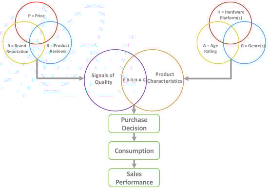 Consumer perceptions are also likely to be influenced directly by a set of innate and directly observable product characteristics. In the specific context of video games, this would include determinants such as genre (G) and age ratings (A), which have also been shown to affect commercial performance in the movie industry [,,]. Additionally, video gaming is an example of a two-sided market where consumers access products or services via an intermediary platform; in this case, the incompatible hardware models produced by each of the three major manufacturers Sony, Microsoft, and Nintendo. Consumers in these ‘two-sided’ markets benefit from network and cross-side network effects, whereby utility is dependent on the volume of platform use among the volume of other users and the variety of user types, such as software developers []. In the case of video gaming, it is, therefore, likely to be essential to account for the hardware platform of release (H), which may affect demand due to both the size of the user base and the product release strategies adopted by product developers []. Together, these innate product characteristics combine and potentially interact with credible signals of quality to form the perceptions that influence a consumer’s purchase decision, which in aggregate determine the commercial performance of individual products, measured in terms of unit sales.