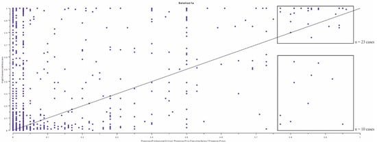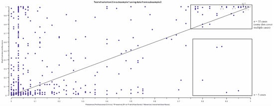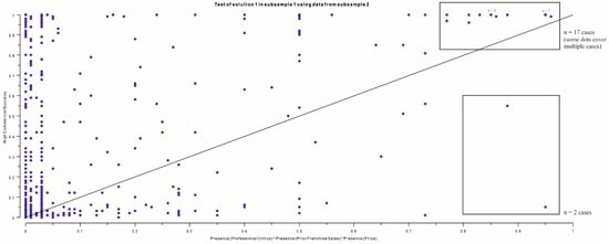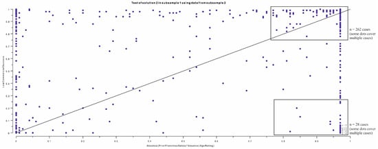 Gigerenzer and Brighton [] support the focus of accuracy via predictive validity and cross-validation testing as a reliable model selection criterion. Predictive validation is a standard approach for assessing models’ relative performance and, thus, theory advancement (for example, []). The sample was randomized and split into two subsamples––a modeling sample and a holdout sample to test for predictive validity. Table 5 includes a predictive validation of Solution 1 and 2 for high sales performance, while Table 6 includes a predictive validation of Solution 2 for low sales performance. The findings indicate highly consistent models with high coverage (solution 1––high sales performance: consistency: 0.77, coverage: 0.28; solution 2––high sales performance: consistency: 0.73, coverage: 0.42; solution 2––low sales performance: consistency: 0.86, coverage: 0.70). Additional predictive test findings are shown in Figure 5 and Figure 6, which are XY plots showing tests of solutions 1 and 2 respectively in Subsample 1 using data from Subsample 2. Figure 7 is an XY plot showing a test of Solution 2 in Subsample 1 using data from Subsample 2. These figures support the conclusion that the highly consistent solutions for Subsample 1 have high predictive abilities for Subsample 2 and vice versa.