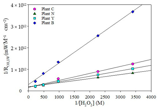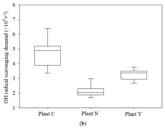 - The mean OH radical scavenging demand for plants C, N, Y, and B were 42,346 s−1, 20,659 s−1, 32,232 s−1, and 81,669 s−1, respectively. The OH radical scavenging demand tended to increase with DOC.