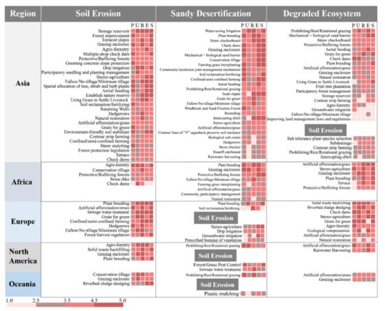 In Asia, we found 13, 17, 10, and 12 biological, engineering, agricultural, and management RTs, respectively, including artificial afforestation or grassland restoration, terraces, agroforestry, and natural restoration (i.e., protecting the site to allow natural recovery). The engineering RTs accounted for the largest proportion of the total, followed by the biological RTs. In Europe, agricultural RTs account for the largest number (6 RTs, including fallow/no-tillage/minimum tillage and agroforestry), followed by management (5, including confined/semi-confined farming and natural restoration) and engineering (5, including Grain for green and check dams), and biological RTs (3, including artificial afforestation or grassland restoration and plant breeding). We also found 14 African RTs, of which agricultural RTs accounted for the largest number (5, including agroforestry and conservation tillage), followed by biological RTs (3, including plant breeding and protective/buffer forests), engineering RTs (3, including terraces and check dams), and management RTs (3, including grazing exclosures and natural restoration. North America and Oceania reported fewer RTs, with totals of 9 and 7 RTs, respectively. Of these, the biological and engineering RTs accounted for the largest proportion in North America, whereas the management RTs accounted for the largest proportion in Oceania, followed by biological. This analysis suggests that the same technology can be applied to control ecosystem degradation in different regions.