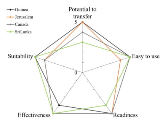 where EI is the evaluation index for RTs, which ranges between 0 and 1, with EI ≥ 0.9 rated as high, 0.65 < EI < 0.9 rated as medium, and EI ≤ 0.65 rated as low. SP, SR, SM, SE, and SSrepresent the technical evaluation scores for the potential to transfer the technology to other regions, ease of use, readiness, effectiveness, and suitability, respectively; the ω parameters represent the corresponding weight for j = 5 dimensions. Under ideal conditions, the weight totals 5 and the score totals 5. We chose the equal weight method and assigned a value of 1 to all weights.