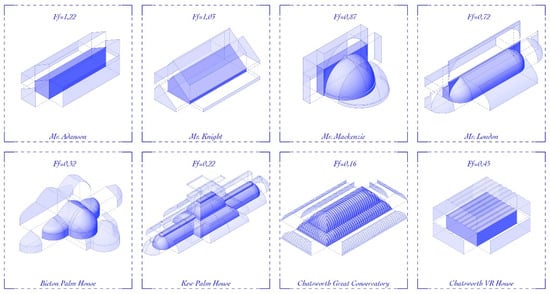 Evolution of form-coupling strategies according to surface-to-volume ratio in various nineteen century hothouses in England. 3D models are rendered according to research on original drawings and sketches from authors. Reproduced with permission from Moraleda, J. Mestre, N. ‘The automatic garden. Typological variations in the hot-house architecture’, published by UPM School of Architecture in 2017.