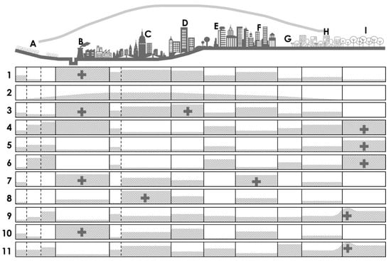 Brussels ecosystem, with subsystems (A–I) and ecological factors (1–11). Based on Duvigneaud, P., Denaeyer-De Smet, S. and Tanghe, M., ‘Importance de l’écosystème urbain et des sous-systèmes’. (1975). Source: Authors, 2021.