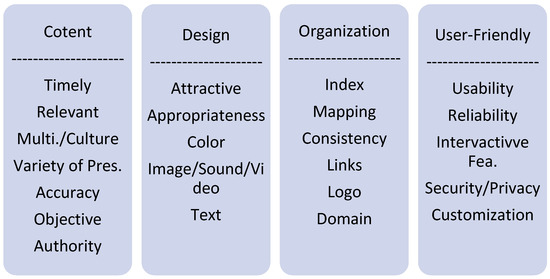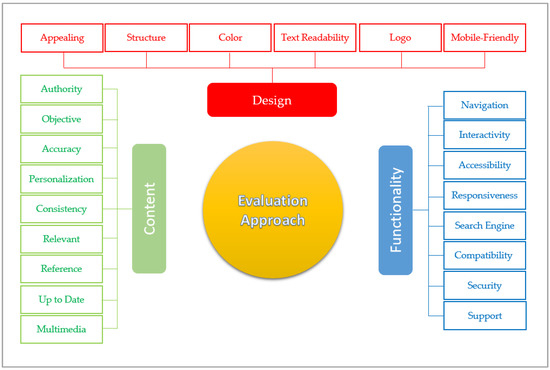 Fourth, the authors studied these suggestions carefully and improved the approach according to the experts’ reviews. Several sub-criteria were changed to those recommended by the experts, and new sub-criteria were added. The final list of criteria remains as it was, and there are now 23 sub-criteria. The finalized criteria and their sub-criteria that will be used for website evaluation are illustrated in Figure 2.