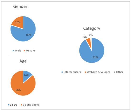 The purpose of the demographic information was to enable an assessment of the responses’ value while weighting the sub-criteria. Figure 3 shows that out of the 436 respondents, 352 were male (80%), and 84 were female (20%). In addition, respondent ages were categorized as either 18–30 or 31 and above. The results show that 376 of the respondents were over 30 years old (86%). Finally, Figure 3 shows that the majority of participants were average internet users (92%), with fewer being developers, or other individuals.
