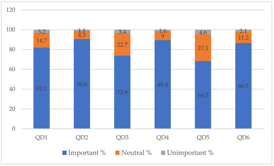 Appealing sub-criterion refers to whether the website looks aesthetic. A total of 82.1% of participants indicated that Appealing is important, while 14.7% indicated that it is a neutral sub-criterion, and only 3.2% deemed it unimportant. Structure sub-criterion refers to whether the information is well-structured. A total of 90.6% of participants indicated that Structure is important, while 8.3% considered it neutral, and only 1.1% deemed it unimportant. Color sub-criterion refers to the suitability of the chosen colors. A total of 73.9% of participants indicated that Color is important, while 22.7% indicated it is neutral, and only 3.4% considered it unimportant. Text Readability sub-criterion refers to whether the text and font size is acceptable and readable. A total of 89.4% of participants indicated that Text Readability is important, while 9% deemed it neutral, and only 1.6% indicated that it is unimportant. Logo sub-criterion reflects the purpose of the website, and 68.3% of participants indicated that Logo is important, while 27.1% considered it neutral, and 4.6% indicated that it is unimportant. Mobile-friendly sub-criterion refers to whether the website is designed to be mobile-friendly. A total of 86.7% of the participants indicated that Mobile-friendly is important, while 11.2% deemed it neutral, and only 2.1% indicated that it is unimportant. Figure 4 shows the participants’ responses for the Design category, which includes six questions identifying the participants’ responses.