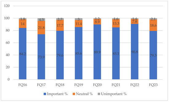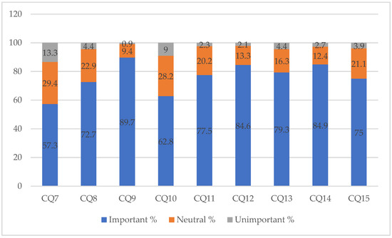 Navigation sub-criterion refers to how clear it is to use each page. A total 84.2% of participants indicated that Navigation is important, while 14% indicated it is neutral, and only 1.8% indicated that it is unimportant. Interactivity sub-criterion refers to whether the website allows the user to interact with it. A total of 73.9% of participants indicated that Interactivity is important, 21.8% deemed it neutral, and 4.3% considered it unimportant. Accessibility sub-criterion refers to how easy it is to access the website for elderly and disabled people. A total of 79.6% of participants indicated that Accessibility is important, 17.7% believed it neutral, and 2.7% believed it unimportant. Responsiveness sub-criterion refers to whether the website responds to inquiries. A total of 85.6% of participants indicated that Responsiveness is important, 11.4% considered it neutral, and 3% considered it unimportant. Search Engine sub-criterion refers to how easy it is to find information, A total of 89.9% of participants indicated that Search Engine is important, 8.9% deemed it neutral, and 1.2% considered it unimportant. Compatibility sub-criterion refers to whether the website is compatible with all browsers. A total of 85.1% of participants indicated that Compatibility is important, 13.3% deemed it neutral, and 1.6% considered it unimportant. Security sub-criterion refers to how secure user data is. A total of 90.8% of participants indicated that Security is important, 7.8% believed it neutral, and only 1.4% considered it unimportant. Support sub-criterion refers to whether the website provides support to users. A total of 79.3% of participants indicated that Support is important, while 18.6% considered it neutral, and 2.1% considered it unimportant. Figure 6 shows the participants’ responses to the Content category, including eight columns that identify the participants’ responses for each question.
