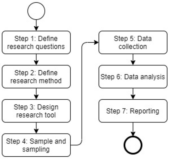 Survey research is generally used to draw conclusions about a wider pre-defined population by collecting information from a sample population [37]. This is relevant for this research because it can help reveal the circular business processes used in practice. The steps of the survey research methodology adopted here are based on the checklist of Kelley and Clark [37], who describe good practice for the conduct and reporting of survey research. The purpose of this checklist is to ensure that a survey study has credible results [37]. Figure 1 shows the steps of this research that are derived according to the requirements of the checklist.