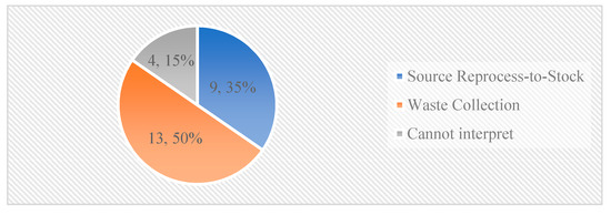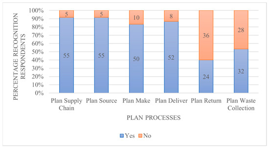Respondents could answer yes or no to the question if they recognized the processes we described. The responses helped us to identify to what extent the processes are applied in practice. The first four plan processes were recognized by most respondents, and the last two were recognized less (Figure 4). However, the process plan return, which is important in CE, was recognized by fewer than half of the respondents whereas the newly added process plan waste collection by more than half.