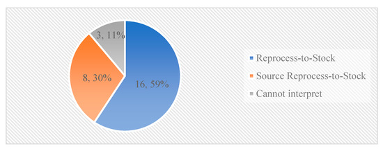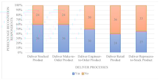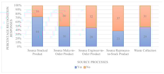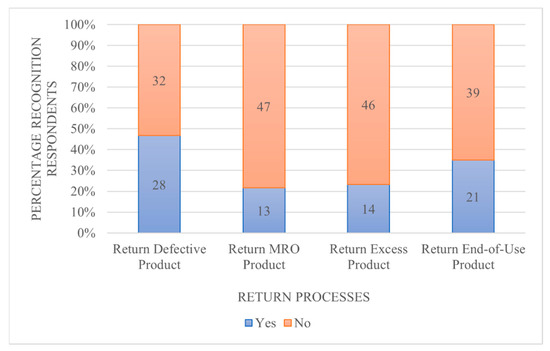 Figure 8 shows the results of the last processes of the survey, namely, related to the return process. In the survey, the source return and deliver return processes were combined and described as return, as this made the survey clearer and would make no difference to the results. We assumed that when a company has the source return process, it also has the deliver return process. Additionally, we assumed that when respondents recognized a return process, they recognized both source return and deliver return. The return processes were generally recognized less often than other processes. Nevertheless, multiple companies are applying them. The added circular process return end-of-use product was actually better recognized than the two SCOR processes return MRO product and return excess product.