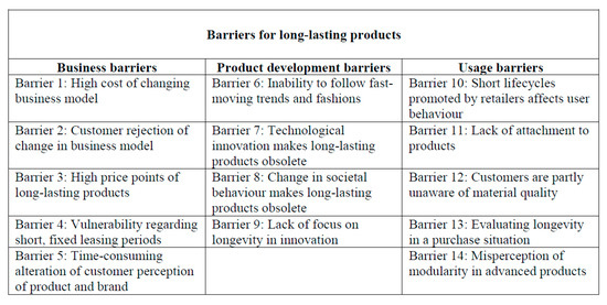 Firstly, in order to understand the approaches to product longevity, we must investigate the potential barriers that can hinder the production of long-lasting products. In line with Jensen et al. [3], we adopt a framework suggesting that there are three main stakeholders influencing the longevity of products. The first is the consumers, through purchase decisions and use. The second is product development, namely, designers and engineers. The third is businesses, through marketing and sales. Through their extensive review, they have addressed 14 barriers that can hinder product longevity (Figure 1):