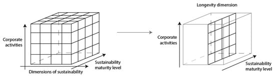 Regarding the sustainability maturity cube, Müller and Pfleger [18] propose the first parameter to be the dimensions of sustainability, namely, environmental, social and economic sustainability. These describe various aims of sustainability, and we argue that longevity can be perceived as a subcategory of environmental sustainability, thereby enabling a section view of the sustainability maturity cube. To investigate corporate activities and sustainability maturity levels, we now consider this section view.