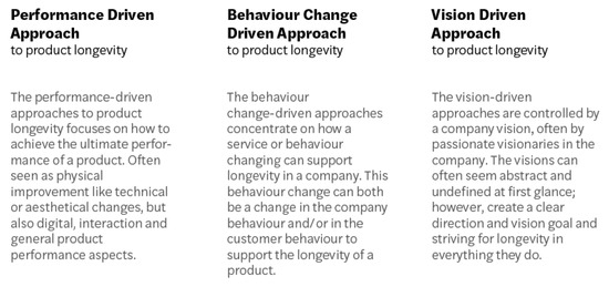 Through interviews and an extensive multiple-case study of 18 best-practice companies producing a wide variety of products, we catalogued several business and development approaches that elucidate the concept of longevity. These approaches shared similarities and were divided into three major categories: performance-driven, behavioural-change-driven and vision-driven approaches (see Figure 4).