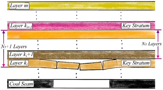 In KS theory, the potential key strata also need to meet the condition that the breaking distance of the lower one is smaller than that of the upper one (see Equation (4)). Otherwise, all the rock loads controlled by the upper one need to be applied to the lower one, and then the breaking distance of the lower one is recalculated until all key strata are determined, i.e., Equation (4) holds for all potential key strata. Apparently, KS theory still does not describe the calculation method of the breaking distance of the rock layers between two adjacent key strata. Here, we add an additional hypothesis to solve this problem. Supposing that we have obtained N2 key strata, and one of them is numbered with the corresponding load , where represents the layer of the overburden and . The number of the rock layers controlled by layer can therefore denote as . When the layer is broken, the layers composite beam with layer as its first layer can then be regarded as an N3 layers composite beam with layer as the first layer, as shown in Figure 2.