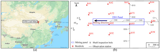 (a) Locations of the YPH coal mine and (b) relative position of the 2201 mining panel, observation stations, and boreholes.