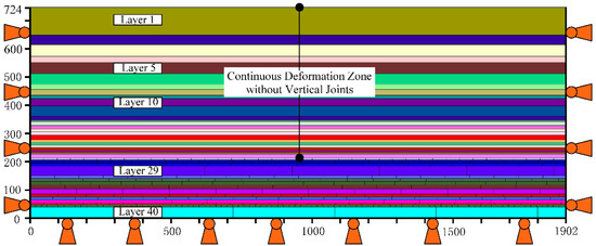In the UDEC modeling process of large-scale strata, it is difficult to construct detailed discontinuities such as joints and cracks of different directions and scales, mainly due to the following two reasons: (1) under the constraints of UDEC software algorithms and computer computing power, simulating a large number of joints will lead to extremely long calculation times; (2) under the current technology level of geological exploration, the detailed spatial distribution of discontinuities cannot be given. In such a case, the modeling idea of equivalent joint (i.e., simplified or fictitious joint) is popular [3,4,5,6]. Specifically, researchers often use a horizontal joint to simulate the bedding plane and use evenly spaced vertical joints (ESVJs) that are perpendicular to the bedding plane and run through the entire rock bed to simulate the phenomenon of stratum fracture. It should be mentioned that, in the field, although vertical joints (also called cross joints) [7,8] may actually exist in some strata in local, they are not always perpendicular to bedding planes and are not always run through the entire rock bed [9,10,11]. More commonly, they have limited length and intersect bedding planes at different angles in terms of their sedimentary environment and geological history. In addition, the spacing between vertical joints varies greatly from one place to another; some researchers [12,13,14,15] suggest that the spacing is proportional to bed thickness and the ratio of joint spacing to bed thickness may range from 0.77 to 100 as reported in literatures [16,17].