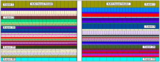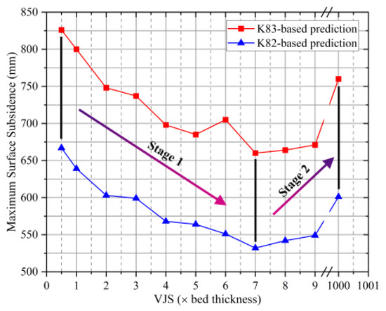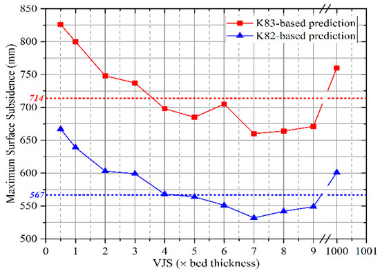 Regarding the influence of our proposed VJS calculation method on MSS, we can see (Figure 10) that, in K83-based models, the MSS (714 mm) predicted by our proposed model is between the values predicted by models with VJS setting at 3× bed thickness and 4× bed thickness, while in K82-based models, that (567 mm) is between the values predicted by models with the VJS setting at 4× and 5× bed thickness. If we consider that in abundant literatures the VJS is set between 1× and 3× bed thickness and the observed MSS in the YPH coal mine is 411 mm, then we can conclude that the prediction by our proposed model is better because it is closer to the field observation. More importantly, we can see (Figure 11) that the VJS based on the proposed method varies in different strata and is no more than 3× bed thickness in most thick beds, suggesting that a smaller but varying VJS setting can also have the effect of a larger VJS setting in large-scale UDEC simulations. We also note that K82-based and K83-based models with the VJS set at 4× to 9× bed thickness achieved smaller MSS predictions, which are closer to field observation, but such a large VJS setting has no precedent and runs counter to the breaking distance of rock roof in the YPH coal mine.