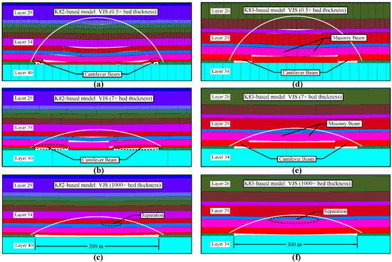 Simulation results of different UDEC models: (a) K82-based model with VJS set at 0.5× bed thickness; (b) K82-based model with VJS set at 7× bed thickness; (c) K82-based model with VJS set at 1000× bed thickness; (d–f) are the same for the K83-based Model. Layer numbers are consistent with that in Table 1 and Table 2.