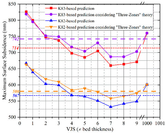 Regarding the influence of the “Three-Zones” theory on MSS, we can see (Figure 12) that in K83-based models considering the “Three-Zones” theory, the MSS is slightly smaller when the VJS is set at 0.5× to 1× bed thickness, is larger when the VJS is set at 2× to 9× bed thickness, and is the same when the VJS is set at 1000× bed thickness. Similar relationships can be found in K82-based predictions. For models based on our proposed method, a larger MSS prediction can also be observed. Since the VJS is set larger than 1× bed thickness in abundant literatures, we can conclude that removing vertical joints in the continuous deformation zone will result in the MSS increasing.