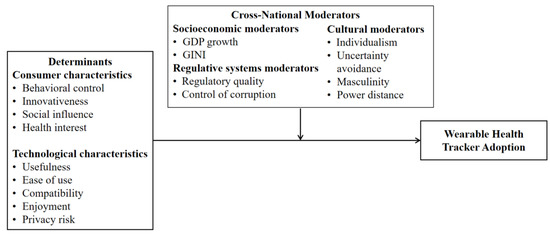 This paper examined how the effects of determinants on wearable health tracker adoption may change across countries through an institutional perspective. An institution is defined as a set of formal regulations and informal restraints that guide political, economic, and social activities in order to maintain order and safety within a society [44]. Building on the definition of institutions, Burgess and Steenkamp (2006) [45] proposed three dimensions to characterize a society: socioeconomic, cultural, and regulative systems. Burgess and Steenkamp (2006) [45] further suggested that it is important to investigate whether empirical findings have strong cross-national generalizability by considering the moderating roles of three institutional dimensions.
