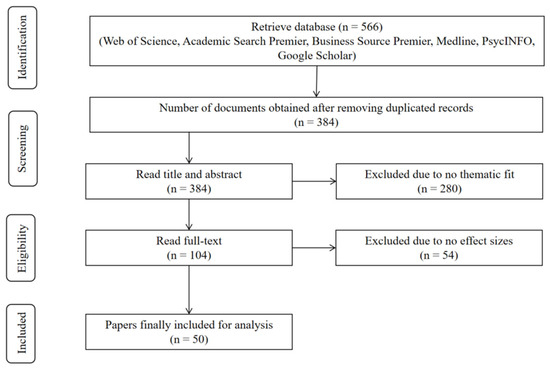The database search yielded 566 records (see Figure 2). After removing duplicates, 384 unique records remained. Then, one author and one research assistant independently screened the title and abstract and identified the same 104 relevant papers. Furthermore, the author and the assistant read the full text of each paper and found 50 papers that provided effect sizes for the focal determinants (see Table 3).