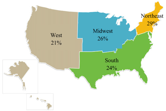 The final sample included 1834 farmers, ranchers, and vineyard owner/operators, who welcomed visitors to their operations, from all 50 states. The majority (58%) of respondents were female. The mean age was 55 years, and the average respondent had a total of 16 years of formal education (i.e., a 4-year college degree). The farms were spread across the four regions of the United States (Figure 1), with the greatest portion coming from the Southern region (29%) and the fewest number from the Midwest (21%).